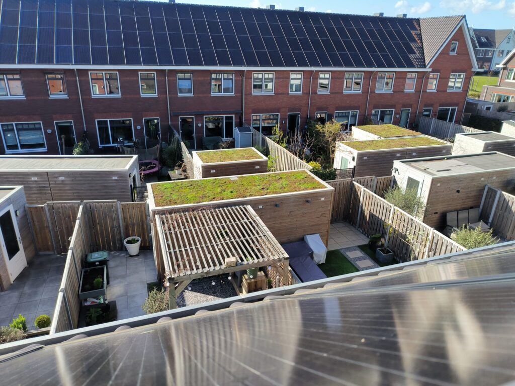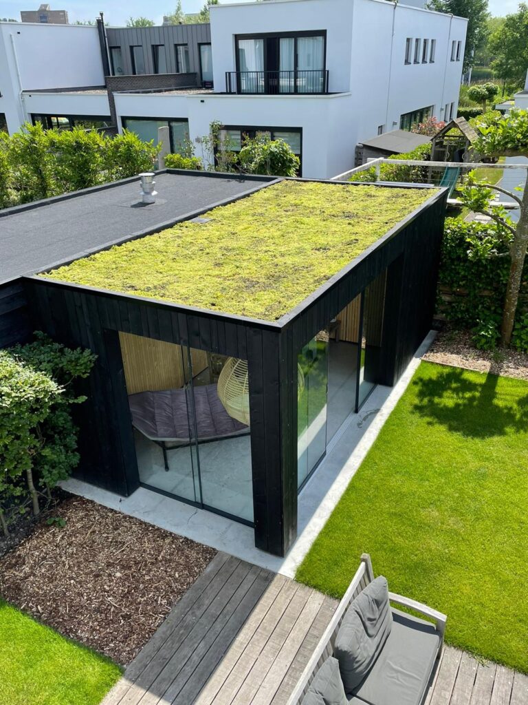 Een Groen Dak draagt bij aan een verhoogde biodiversiteit in de tuin en is ook nog eens een mooie aanvulling in de tuin.